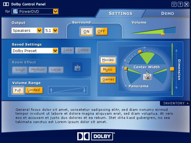 Dolby wanted to provide high quality audio in the PC market and educate users about the power (and existence) of Dolby products by providing  simple, direct access to high-quality audio without alienating its licensees. The project included analysis of research provided by Dolby, user modeling, feature set definition, interface and visual design.